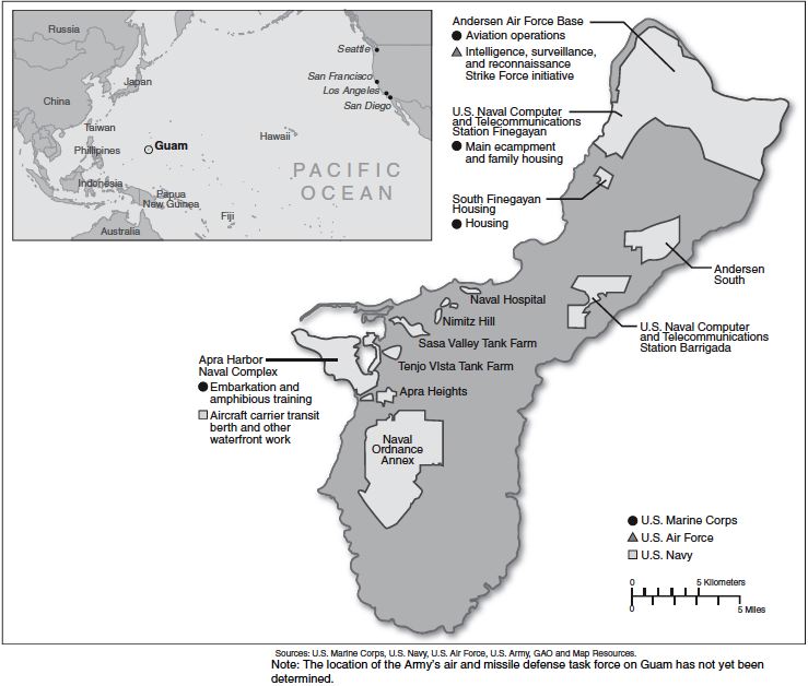 米政府説明責任局(the Government Accountability Office)によれば、グアム移転の費用は150億ドルと見積もられており、米国防総省の見積もりより50億ドル近くも上昇しています。費用の多くは、グアム島から出入りするための高速輸送船、家具、事務用品、グアム本島と北マリアナ諸島付近の訓練用射撃場の土地に使われます。孤立する島を利用するために必要な戦略的輸送支援には、同じことを沖縄で行う場合よりも多い、年間8千8百万ドルがかかります。海軍のグアム統合計画局(the Navy's Joint Guam Program Office)の当局者はグアム移転が海兵隊最良の策だと言います。JGPO当局者は9月15日の議会報告で「計画されたグアムにおける部隊態勢の展開は、我々の国家安全保障の利益、特に我々の世界的な防衛態勢を再編成する戦略に重要です。この正味の影響は…軍の能力を強化して、太平洋における政治的な安定を向上するでしょう」。第3海兵隊遠征軍(III Marine Expeditionary Force)と9,000人の扶養家族は、2012年にグアムへの移転を開始します。しかし、陸軍、海軍、空軍もまたJGPOに関係しています。空軍はアンダーソン空軍基地(Andersen Air Force Base・kmzファイルはこちら)にステルス兵器を扱う監視・偵察攻撃部隊(surveillance and reconnaissance strike task force)の本拠を構えるための計画を終え、建設を始めています。また、韓国の遠征訓練センターと沖縄の土木工学訓練センターを2011年10月中に新しいグアムの空軍基地に移転させます。陸軍は期日を決めていませんが、大隊規模のAMD部隊を含む対空・ミサイル防衛部隊を移転し、巡航ミサイルや無人機に対処するとみられています。海軍は2019年に新しい埠頭が完成したら、航空母艦を頻繁に寄港させる予定です。GAOはこうした移転に必要な工事のために、天然資源と労働者が不足していると指摘しています。基地建設には12,000〜15,000人の熟練した労働者が必要です。グアムにはこれだけの労働者はおらず、外部から連れてくることになります。記事には、地元民を優先的に雇用し、それ以外を他の米国内と外国から得るアイデアが示されています。