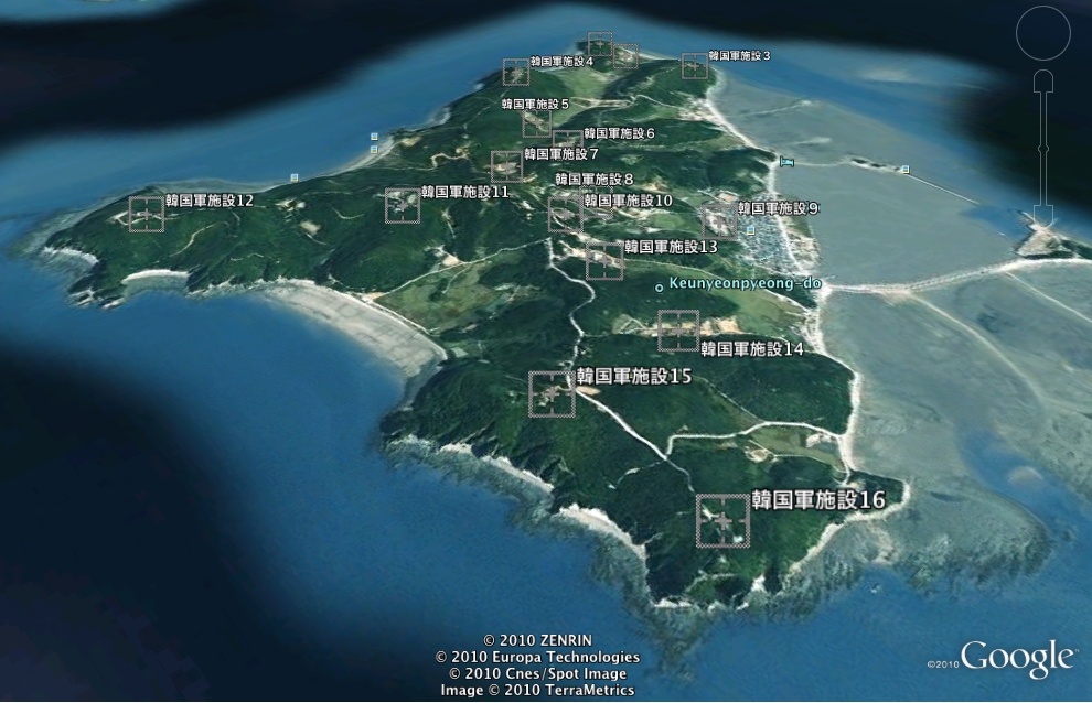 先ほど、テレビニュースを見ていたら、韓国軍施設の「1」と「16」(もしくは「15」)は観光用の展望台であることが分かりました。しかし、北朝鮮軍は「15」か「16」を狙ったらしく、近くに砲弾が落ちています。もちろん、展望台も即席の観測所になります。また、「1」を狙ったと言えそうな位置にも弾着しています。いずれにしても、結論を出すにはもっと正確な地図が必要です。