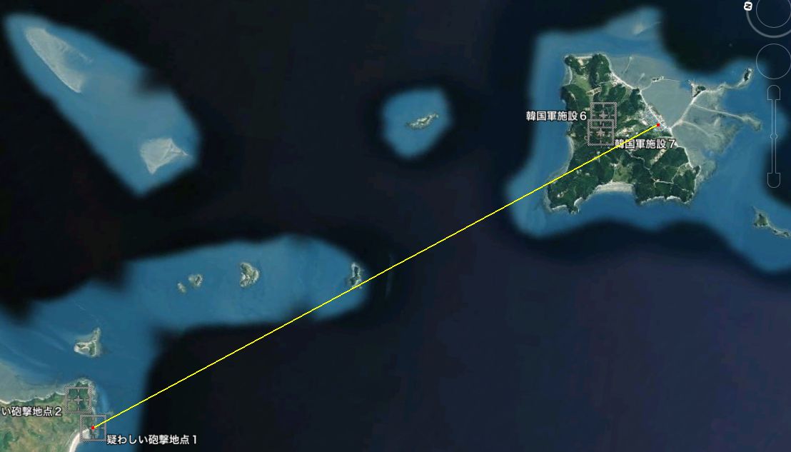 私が「韓国軍施設9」とした場所は学校であることが分かりました(kmzファイルのダウンロード方法はこちらを参照)。私は北朝鮮軍がこの周辺を狙っていたので軍施設と判断しました。ニューヨークタイムズ紙によると、周辺には市民ホールや中学校がある市街地で、軍事施設はなさそうです。コネストの地図を見ても、ここは小学校であることが確認できます。強いて言えば、校庭は臨時の砲台となり得ます。ですが、この弾着は山腹にある砲台「韓国軍施設7」を狙ったのが、山頂を飛び越えて大きく外れたと見るべきです。目標と着弾点は、ざっと見て約1.3km離れています。
