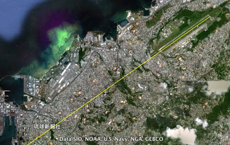 実際にどうだったかは分かりませんが、オスプレイは滑走路と駐機場の間にあるヘリポートを目指したと仮定し、ここに真っ直ぐに向かっていたとすると、下図の通り、飛行コースは琉球新報の少し南東を通過することが分かります。映像に大きな矛盾はありません。