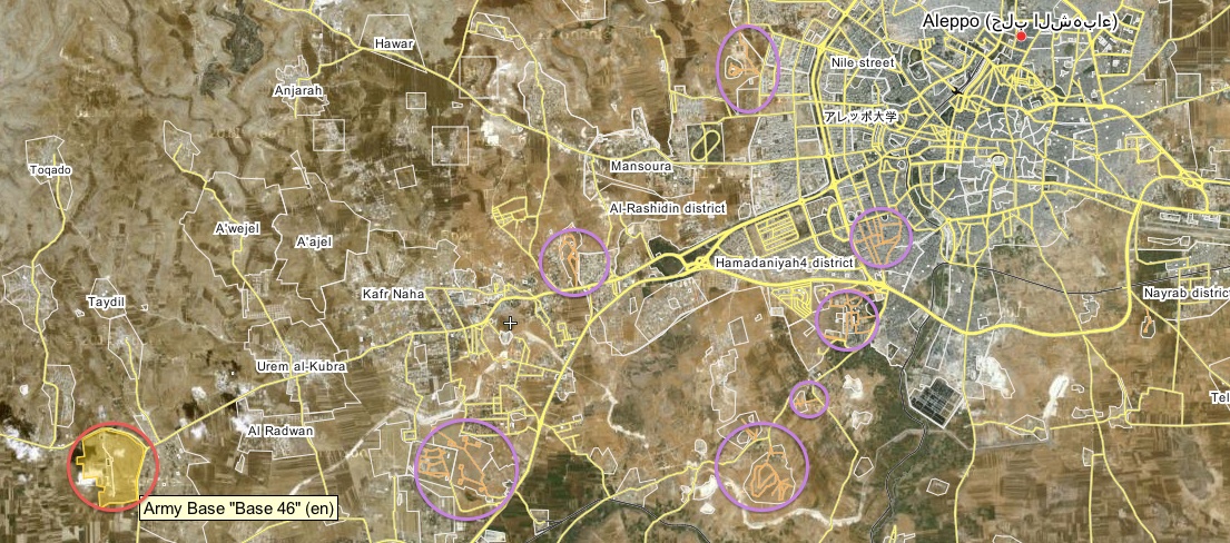 常識的に考えると、紫の丸はほとんどが反政府派の手に落ちているはずなのです。そして、反政府派がそれを宣伝し、アレッポの占領を宣言してもおかしくない状況なのです。しかし、今回報じられたのは、第46連隊の占領だけです。ということは、政府軍施設は反政府派に包囲されながら、まだ持久しているのかも知れません。