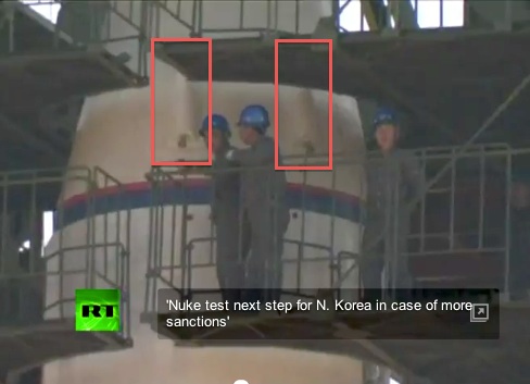 機体側面の小型エンジンですが、別のニュース映像で確認できました。下の写真の赤枠の中が1段機体上部の小型エンジンです。他の位置の小型エンジンもそのままかは、まだ確認していません。色を白く変えたのは、単に見栄えの問題かも知れません。