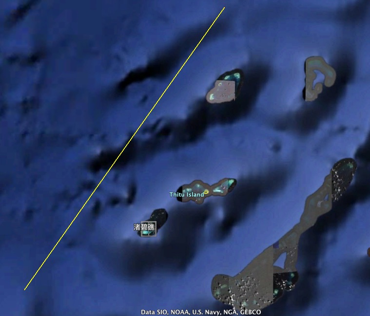 この記事からラッセンがどこを通過したのかを考えてみました。渚碧礁とその北東にあるパグアサ島(フィリピンが支配中・kmzファイルはこちら)、さらに北東のサウスウエスト島(ベトナムが支配中・kmzファイルはこちら)の領海の少し内側を通ると下の図のようなコースになります。真っ直ぐ通過したのか、どこかでUターンしたのかは不明ですが、真っ直ぐ通過した場合を考えました。5時間で133kmを航行したのなら時速26.6kmで、ラッセンの最大船速時速約57kmの半分程度だったことになります。