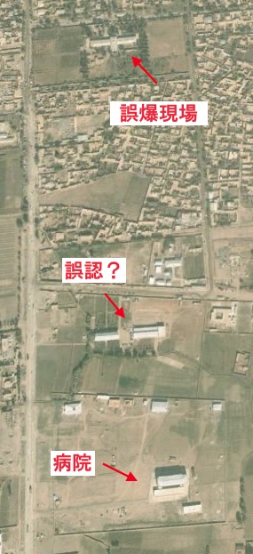 以上の情報から一つの推定が成り立ちます。下の写真中の「現地の病院」付近までタリバンが来ていたのですから、戦闘はこの付近で起きたと考えられます。写真左端を縦に走る道路は空港へ行く幹線道路です。「現地の病院」と「誤爆現場(国境なき医師団の病院」の間には大きな目立つ建物があります。ここにタリバンがいて、AC-130がここと誤って攻撃したのではないかと推定できるのです。