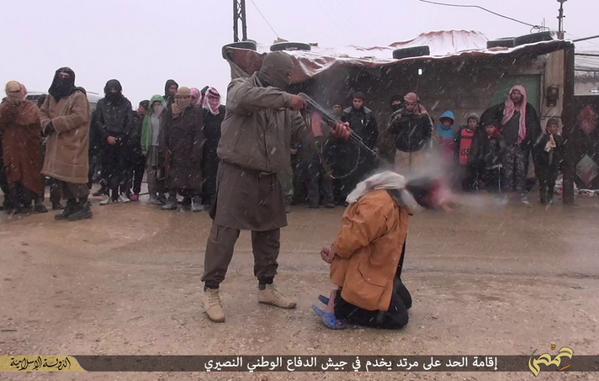 | ブタの姿をしたイスラム国兵士がクルド軍兵士を処刑しようとしている姿です。ここでも敵兵の非人格化が行われています。 |