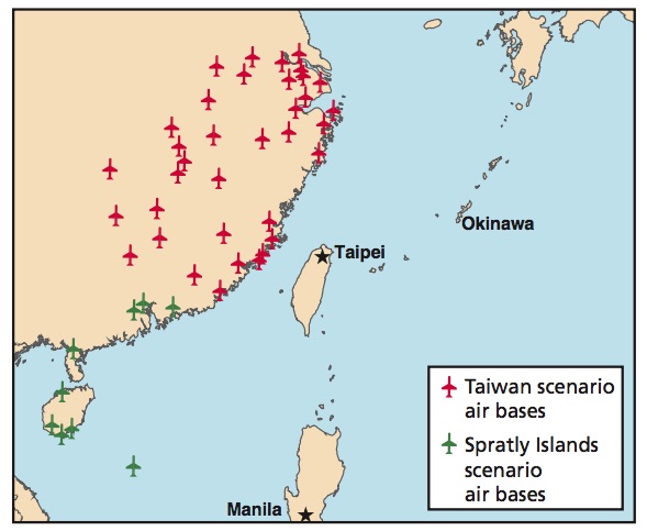 内容を簡単に紹介すると、台湾シナリオでは中国軍は数多くの空軍基地を使えるものの、南沙諸島シナリオでは米軍と同様に利用できる基地は少なく、給油機や指揮統制用航空機が少ないことから、中国の空軍基地を攻撃する許可が出れば、米軍は制空権をとれます。尖閣諸島に中国が一つ以上の小規模な空軍基地や地対空ミサイルを配置しても大きな違いは生じないということです。しかし南沙諸島の基地が完成すると、状況は変わります。