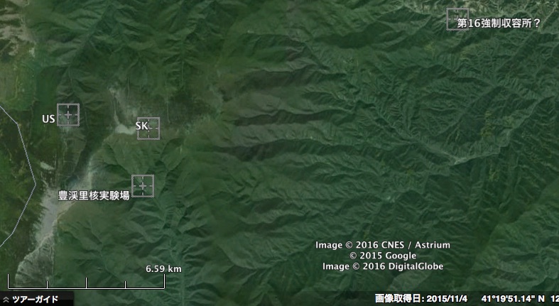 坂東氏が第16強制収容所とする施設は北朝鮮では「第16号管理所」と呼ばれています。2万人を収容する広大な施設ですが、その西端部分が核実験場に近いと坂東氏は言います。しかし、私が計測したところでは、距離は8キロではなく15キロであり、しかも山の稜線で遮られています。核爆発の影響があるとは思えません。「US」「SK」はアメリカと韓国が観測した震央の位置です。