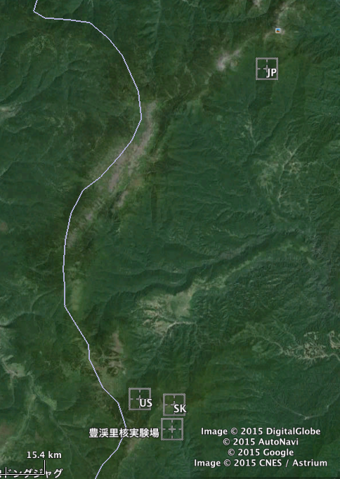 日本、アメリカ、韓国が探知した震央を地図上で見ると、以下のとおりです。日本だけ遙か実験場から約35kmも北にあります。坑道がここまで続いているとは考えにくく、正しい震央の位置とは思えません。お陰で前回の記事で間違いを書く羽目になりました。このように震央は誤差が大きく出るものなのです。震央付近に地崩れなどがないから徴候がないとは結論できません。