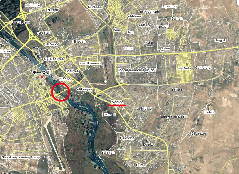 モスル東部はほとんどイラク軍に占領されたとみてよさそうです。ワヒダは下の図では赤線、第4橋は赤丸の部分です。これまでに占領した地域と合わせても、東部はほとんど占領済みということになります。