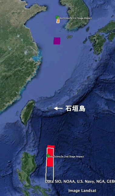 テポドン2号が正常に飛ばず、墜落した場合で、1段機体を切り離してから3段機体を切り離すまでに異常が起きた場合だけ、石垣島付近に落下する可能性があります。それよりも後に問題が起きた場合は、機体は石垣島を飛び越えてしまいます。