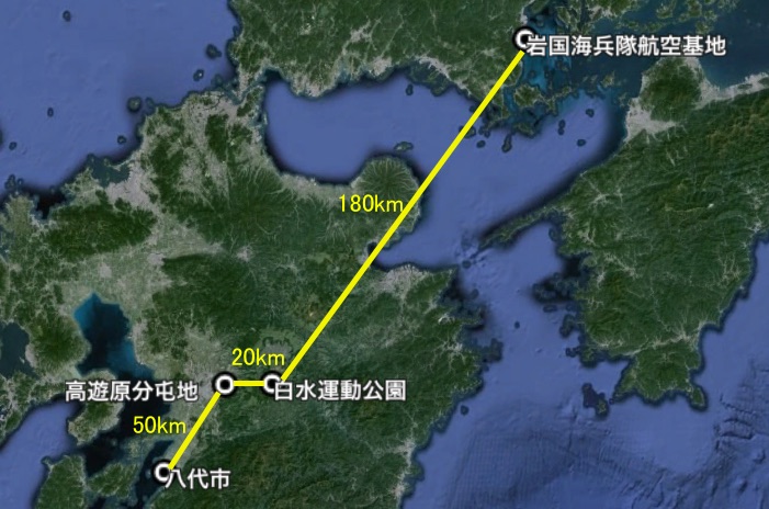 岩国の海兵隊航空基地を出発したオスプレイは高遊原分屯地で救援物資を積み込み、南阿蘇村の白水運動公園で荷下ろしをします。普通なら、高遊原分屯地で燃料を補給して岩国に戻るはずですが、さらに50km先の八代市沖合に停泊している護衛艦「ひゅうが」の甲板に着陸して補給を受けるのです。どう考えても高遊原分屯地で補給を受けるのが合理的です。単に護衛艦でのオスプレイへの燃料補給という実績を作るための細工です。