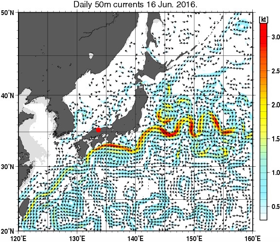 図を見ると、シュラウドの落ちた海域からは北へ向かう海流があったことになりますが、対馬海峡へ流れ込む海流につかまると、東へ移動することが分かります。赤丸で示した湯梨浜町に向かい、海流が海岸へ向かっていることが分かります。