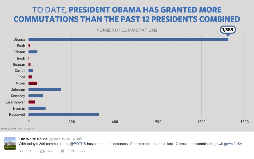 ホワイトハウスのツィッターのアカウントは「209人の減刑と64人の特赦により、@POTUSは今しがた273人のアメリカ人に第二のチャンスを与えました」とホワイトハウスのツィッターアカウントは述べました。(訳註 @POTUSはオバマ大統領)