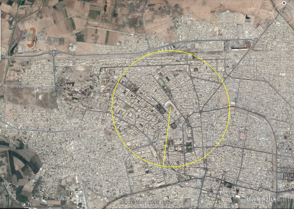 戦況は最終段階と言いいます。市内のスタジアムを中心に面積が4平方キロの円を描くと、下の図のようになります。まだ、しばらくの戦いが必要なようです。