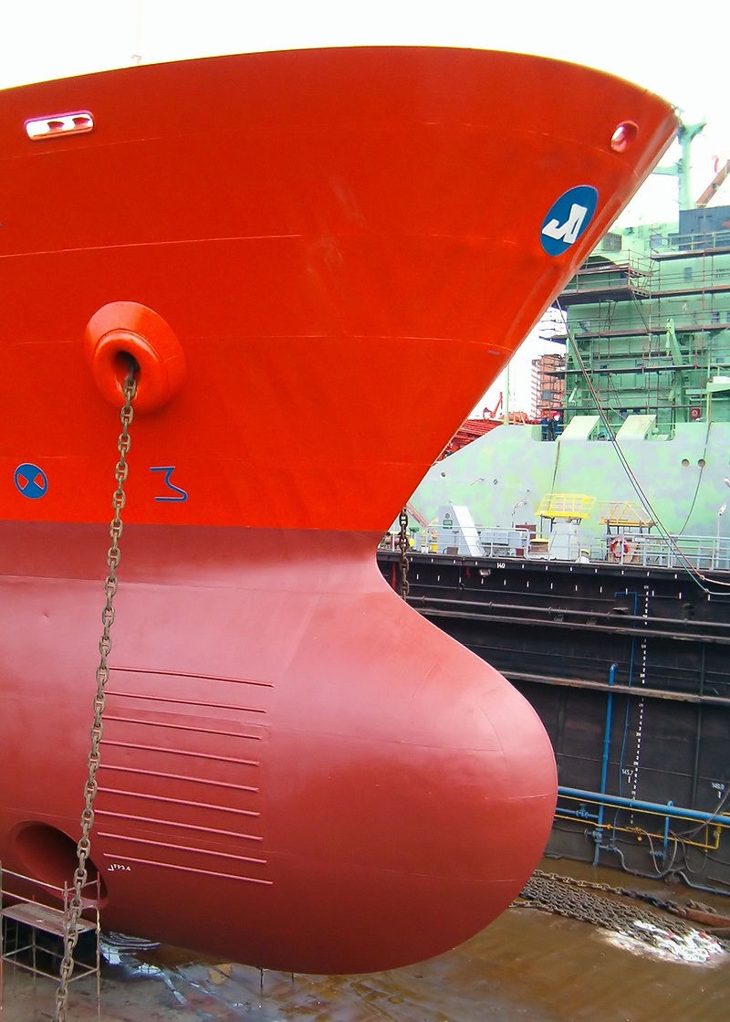 なお、バスバスバウとは下の写真のように、艦首の吃水線の下にある半球状の突起です。波の抵抗を減らすための装置です。