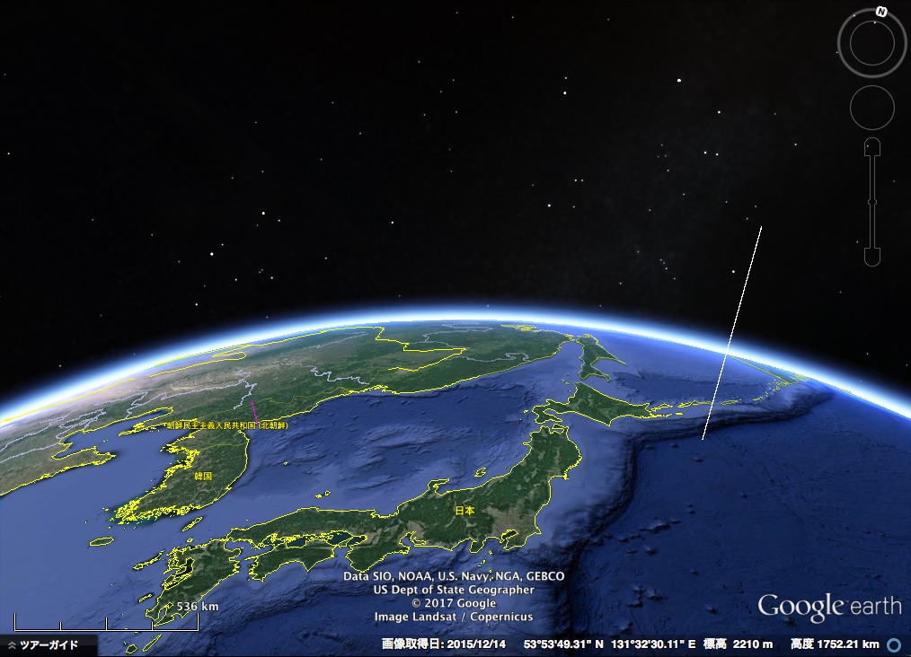 火星12号のブースターの燃焼時間は約3分間です。燃焼が終わると、ブースターは弾頭から切り離されて、落下します。その時、火星12号は発射地点から約200km移動して、高度は約100kmです。下の図のピンク色の棒の先端あたりです。少々見づらい点はお詫びします。
