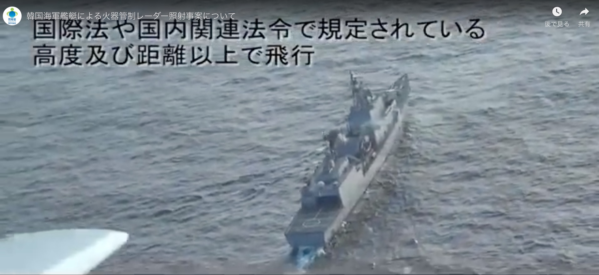 防衛省はビデオ映像に「国際法や国内関連法令で規定されている高度及び距離以上で飛行」と字幕をつけていますが、通過した際の高度は示しませんでした。なお、国内関連法令は当然ながら国際法に準拠していないと意味がないので、国際法の規定に合致していたというだけで十分だったと思われます。現場は排他的経済水域ですから天然資源などに関しては優先権がありますが、日本の主権は及びません。つまり国内関連法令をいう意義は特にありません。問題は国際法が何かということで、これは韓国政府からもどれを指すのかと疑問の声が出ています。