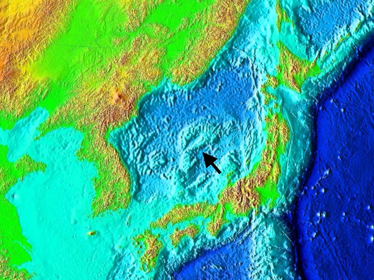 韓国の報道では現場は「大和堆の南」です。下の図の矢印が示す水深の浅い部分です。真ん中に海嶺がありますが、大和堆はその南側の部分です。