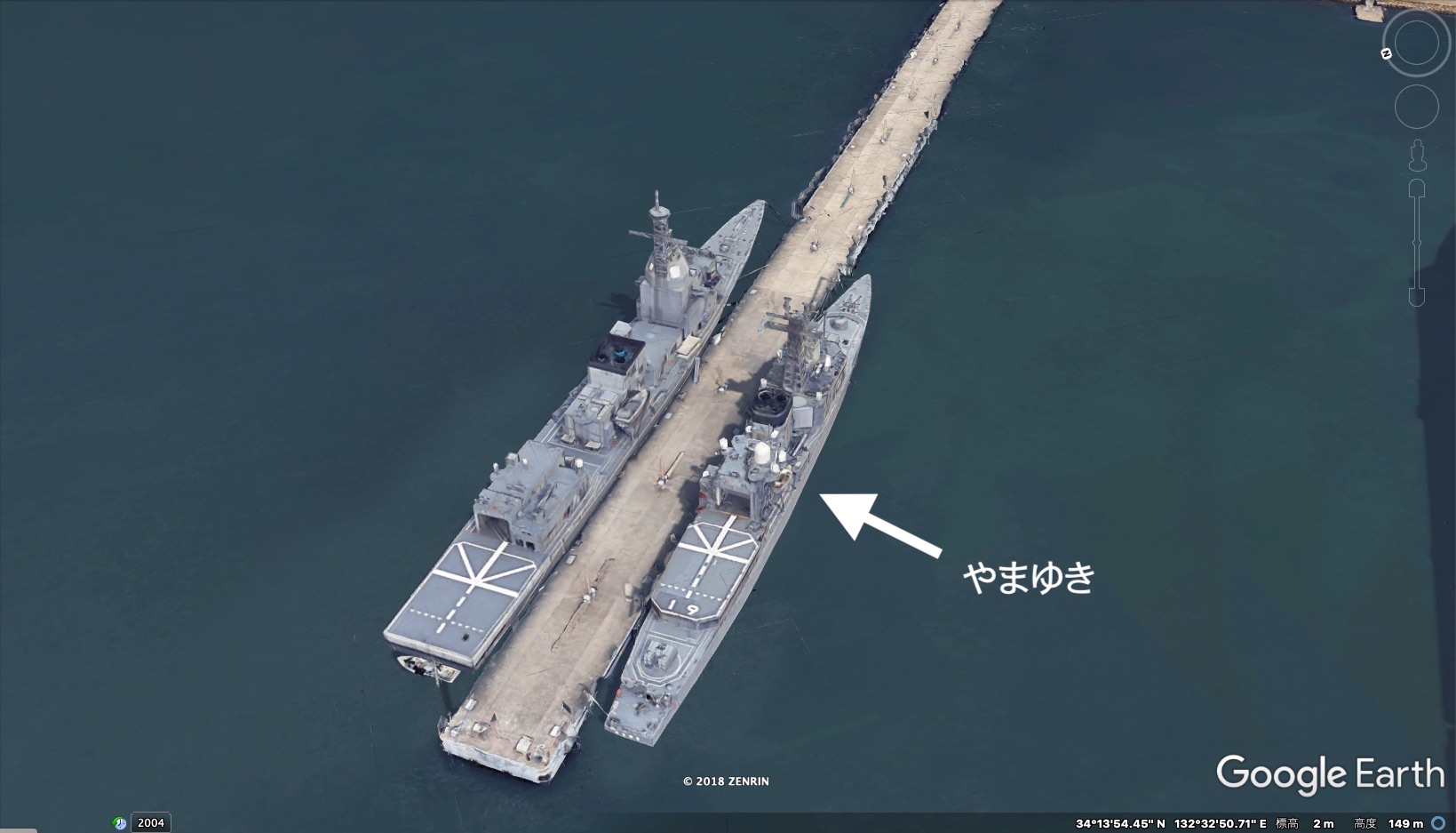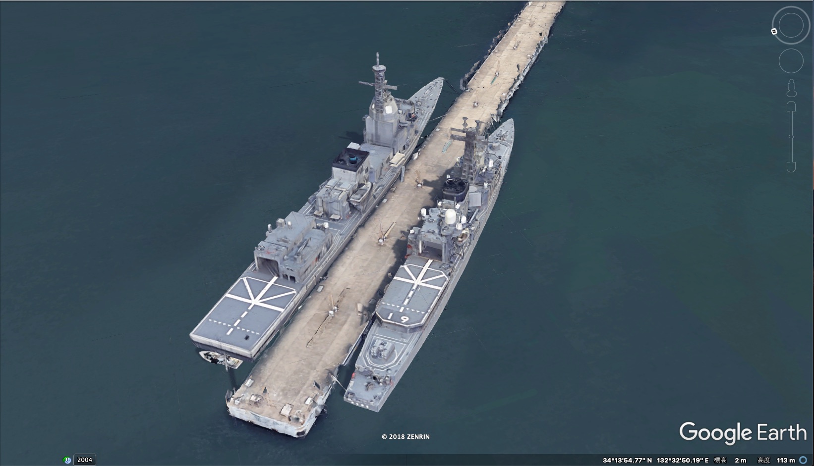 Google Earthの3D機能で呉港に停泊する広開土大王に比較的近い大きさの海上自衛隊の練習艦で飛行高度を検証しました。写真の右側の艦は艦番号が「3519」であることから「やまゆき」と分かります。