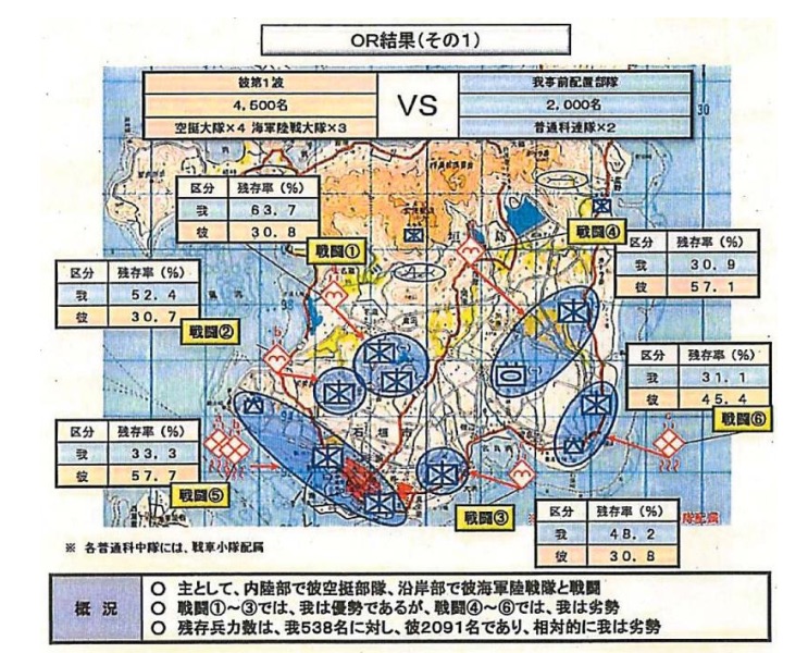 それによると、敵兵数を4,500人、事前に配備された自衛隊を2,000人として、どちらかが残存兵が30%になるまでに戦闘を行うと、敵が2091人、自衛隊が538人で劣勢となりました。しかし、「奪回作戦部隊」の約1,800人が加わって戦闘を続けると、最終的には敵が679人、自衛隊が899人となり、2,000人の増員で奪回は可能という結論だったといいます。
