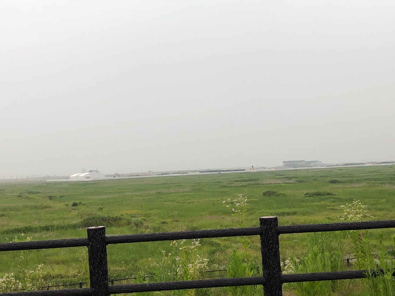現在、その山には墓地が造成され、震災の慰霊碑も建てられました。この写真はそこから小学校(左)、大平山への経路上にある放射性物質汚染廃棄物の集積所である請戸仮置場(右)を収めたものです。