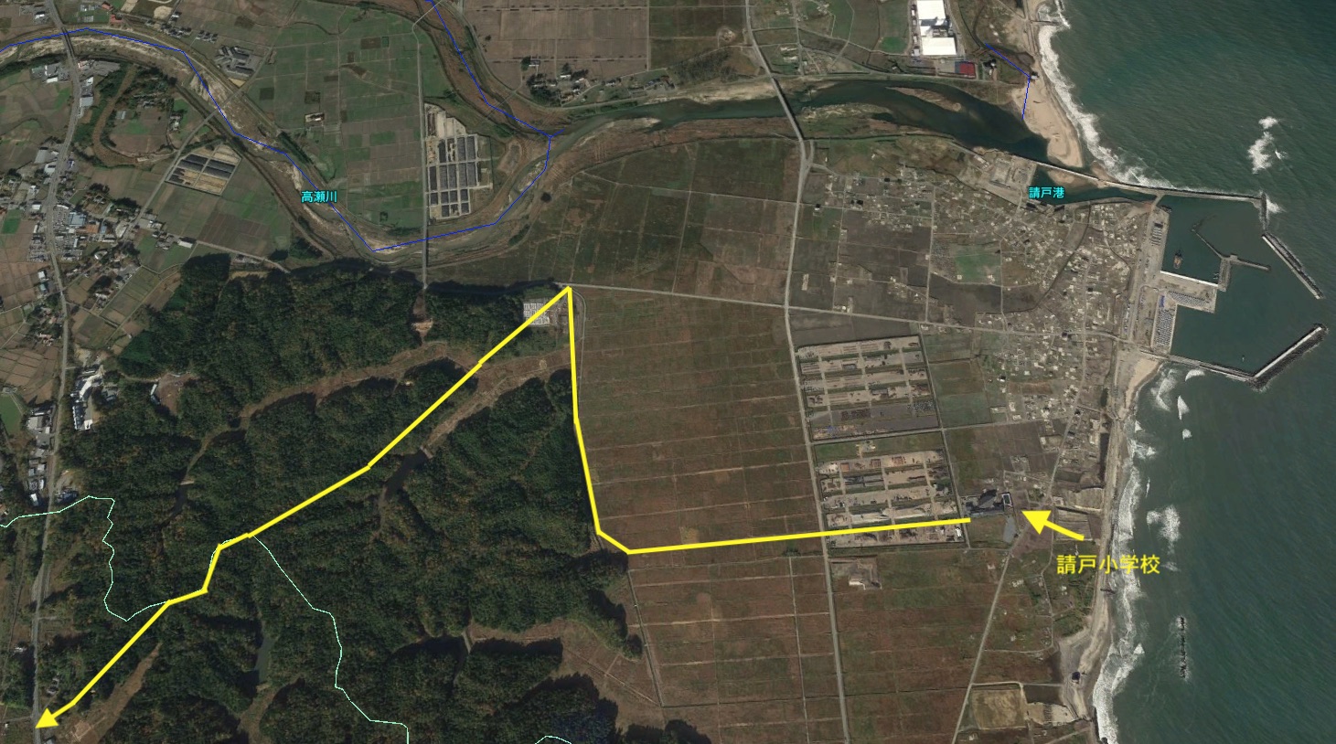 当時、生徒たちは学校にいましたが、近所の人が「津波が来る」と教えてくれたため、直線距離で1.3キロほど西にある小さな山、大平山へと逃げました。歩いた距離は1.7キロ程度です。校長先生と教頭先生は電話や駆けつけた親に対応するために学校に残り、津波が来る直前に避難しました。山への登り方は部活でここに来たことがある生徒が知っていたそうです。彼らは寒くなってきたので、さらに約2キロを歩き、山の西側、双葉町への境界線を超えて山を降りて、国道6号線で通りかかった運送業者のトラックに拾われて避難所まで移動しました。結果、この小学校は全員が無事でした。