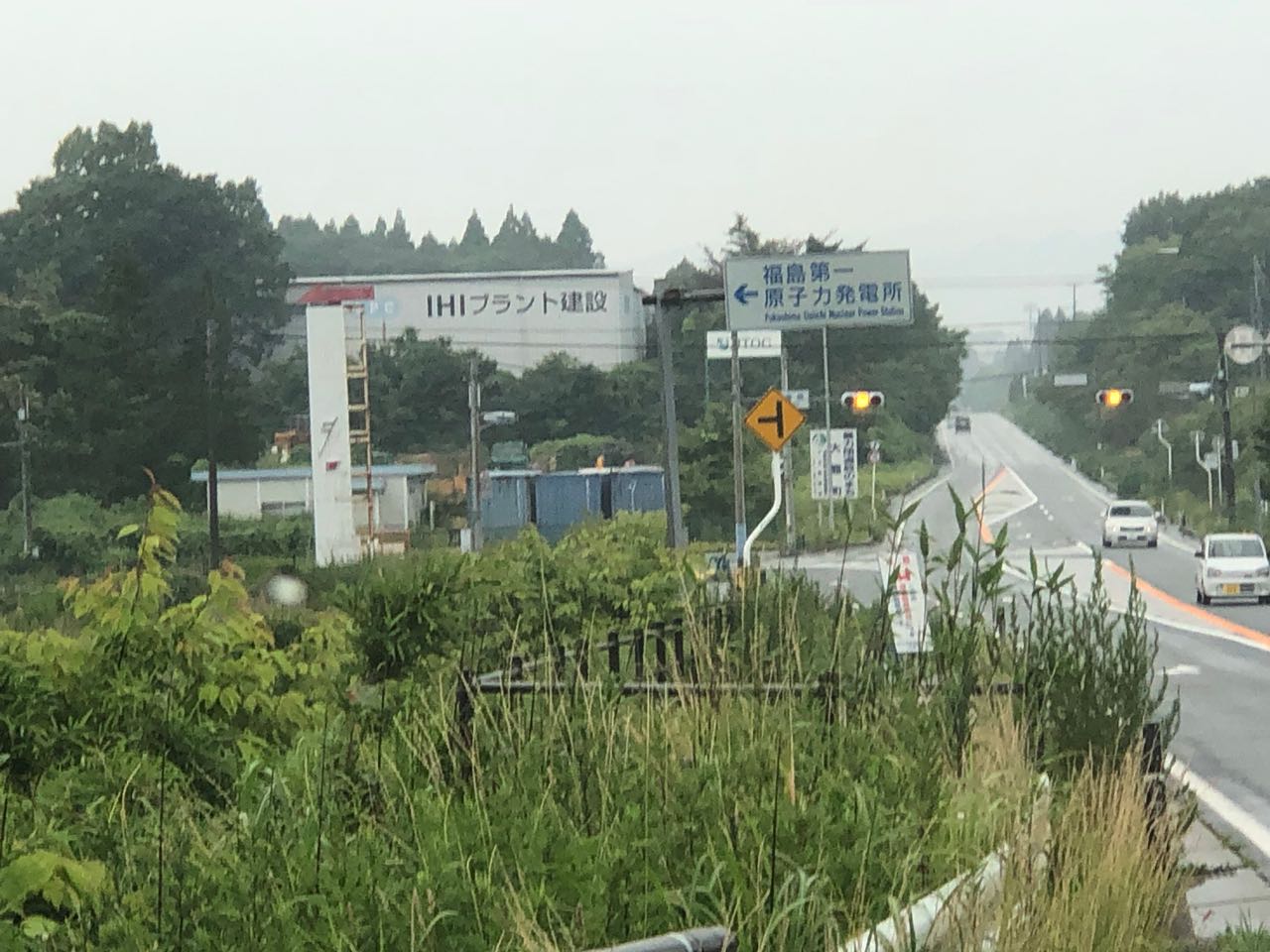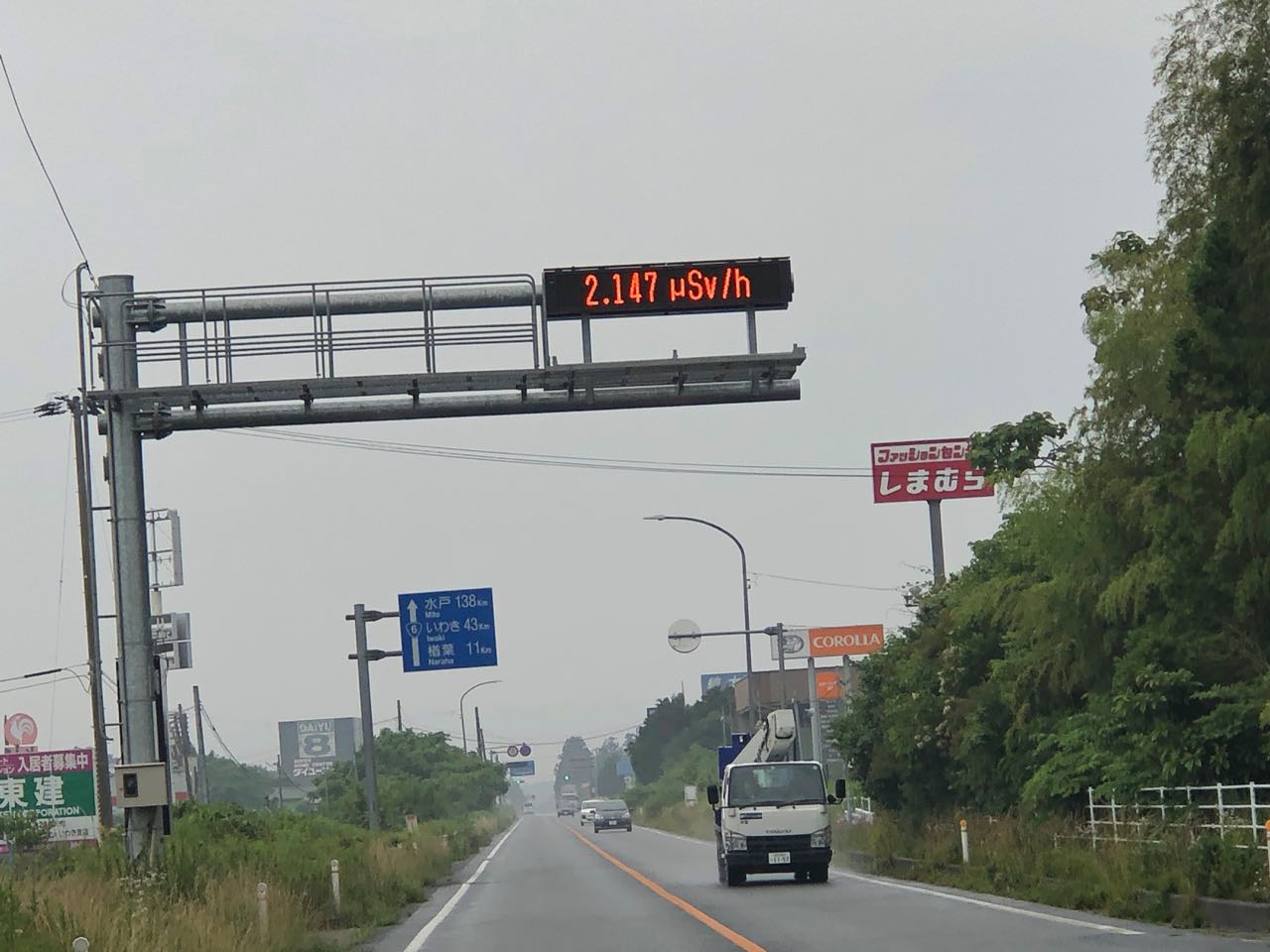 6号線沿いのあちこちに線量計があります。先に示した線量計と比べると、かなり数字が高いことがわかります。私が見た線量計で一番高かったのは3マイクロシーベルトだったと記憶します。企業の看板がたくさん見えますが、建物はすでに活用されていません。本当に不気味です。