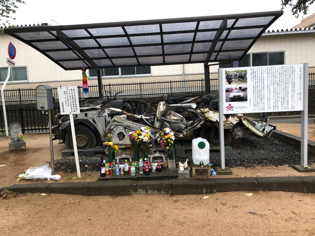 夜ノ森に展示されている警察官2名が殉職したパトロールカーの残骸です。めちゃくちゃに壊れた車体が津波のエネルギーを物語っています。何度も津波で横転させられ、叩きつけられたのでしょう。