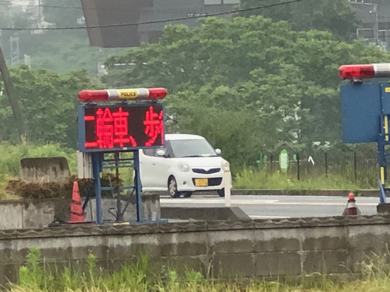 6号線上にあるここから先が帰還困難区域であることを示す電光掲示板。二輪車と歩行者は入れないことを示しています。