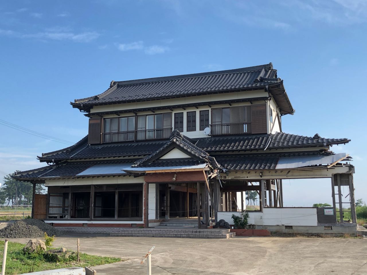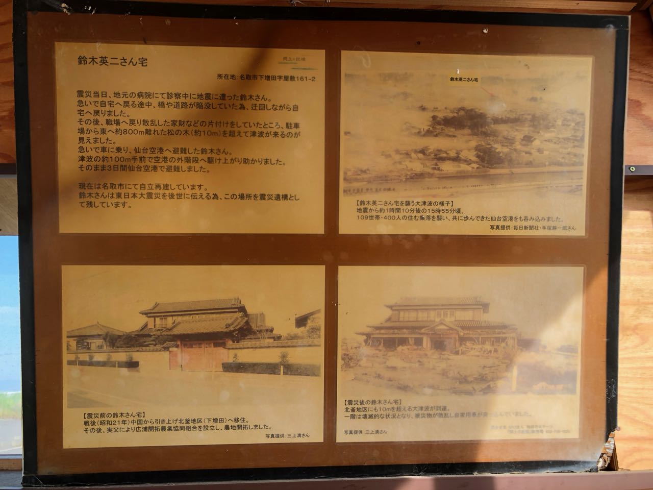 神社のすぐ近くに鈴木英二氏宅があります。もともとは、門と塀、離れまである立派な住居でした。取り壊さずに震災の遺構として残されているのです。鈴木家は車で仙台空港まで逃げ、難を逃れたそうです。