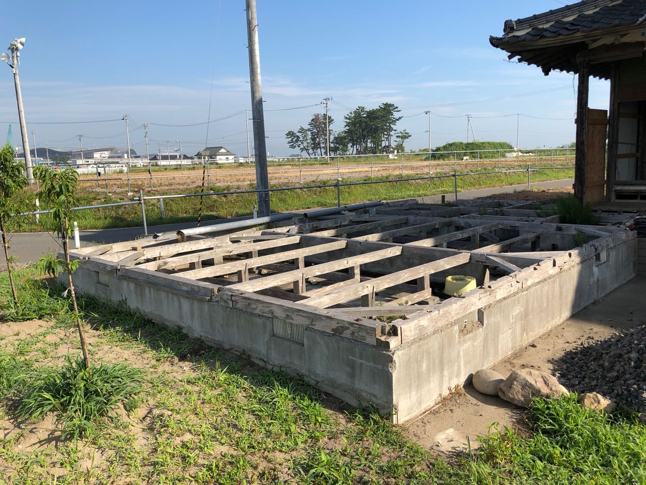 門と塀は基礎部分しか残らず、左側の離れは基礎だけになり、母屋の右側は壁がもぎ取られています。天井板も外れているところがあり、水がそこまであがったことが分かります。