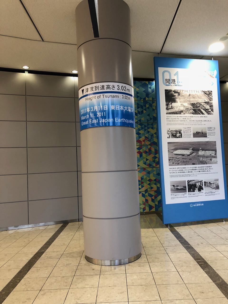 海岸から空港ターミナルビルまではわずか1.1kmしかない仙台空港も被災しました。私はCNNの映像で仙台空港が浸水し、ヘリコプターやセスナ機が流されていくのを見て、声を上げた記憶があります。空港の建物は一階が浸水し、3.02メートルの高さまで波が到達しました。写真は帰りの便に乗る前に撮影したものです。