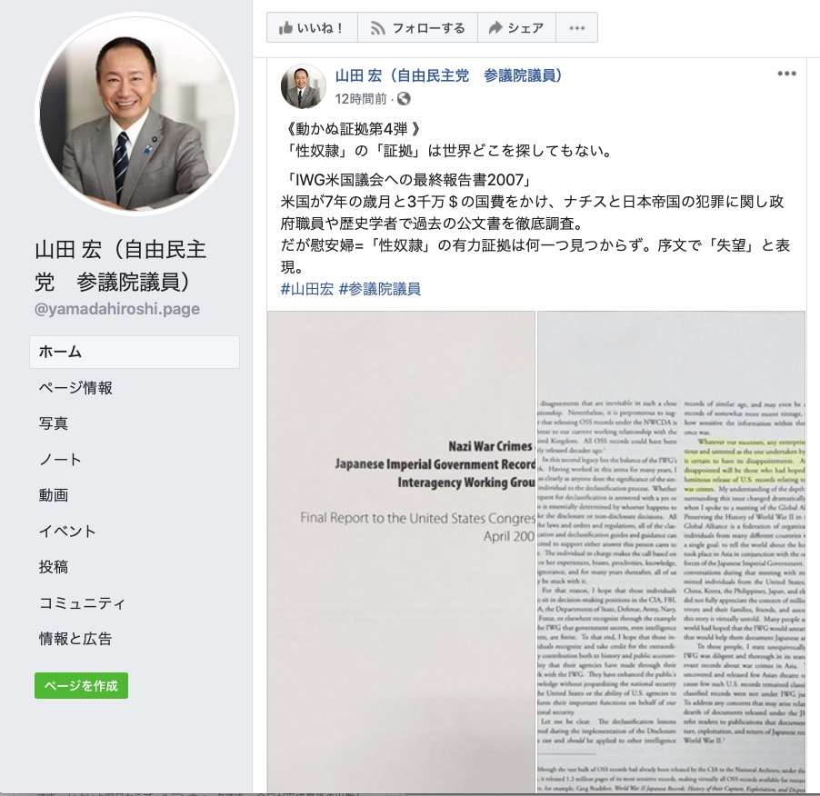 自民党の山田宏参議院議員が5月8日にフェイスブックに慰安婦が性奴隷だった証拠はないとの投稿を掲載しました。