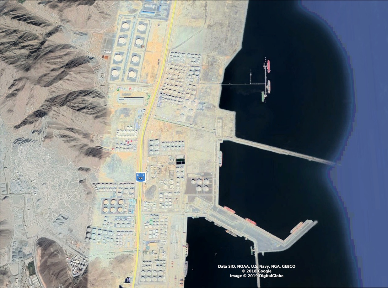 フジャイラの石油出荷施設というと下の写真がその施設です。沖合まで桟橋があって、そこに石油タンカーを接岸して、パイプを使って石油をタンカーへ移します。